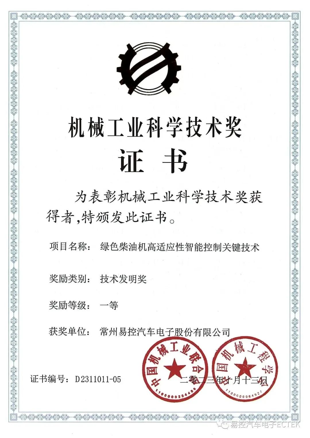 机械工业科学技术奖是国内机械行业领域由国家批准的重要奖项,其中一等奖由中国工程院、中国科学院、机械行业领域的院士和知名专家严格评审。奖励对象是在机械工业科技领域做出创造性贡献,为推动机械工业科技进步,提高经济效益和社会效益做出突出贡献的单位和个人。《绿色柴油机高适应性智能控制关键技术》项目获此殊荣,无疑是行业对常州易控科技创新实力与智能制造能力的双重印证。